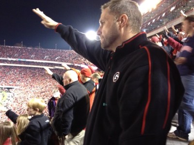Now, let me give you a little history. At the beginning of the fourth quarter, all the fans stand up and hold up the number four on their hands. Then, as the quarter starts, they pump their hands up and down. (The why in this equation is what I can’t begin to explain. I just know this is what they do.) Now, in the nine years I’ve gone to games with Greg, he has never, EVER participated in the fanfare. No cheers, no chanting with the crowd, no “goooooo dawgs, sic ’em” at the kick offs, no number four at the fourth quarter. NE. VER.