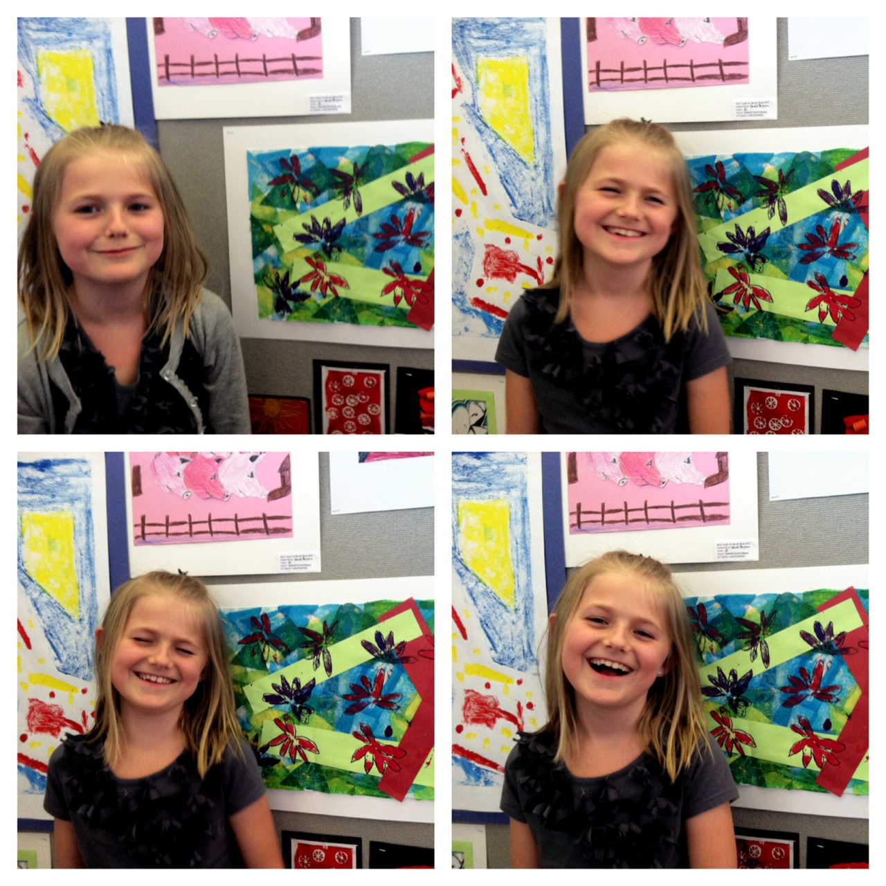 I strongly urged her to get a picture of her in front of her art, and these were the best shots I could manage. She’s groaning and complaining each time, saying she’s embarrassed about getting her picture taken while people are walking by. One could say she was quite unwilling. Which again, begs the question — how can she stand and sing in front of 300+ people at a talent show, but not want to simply smile and say ‘cheese’??