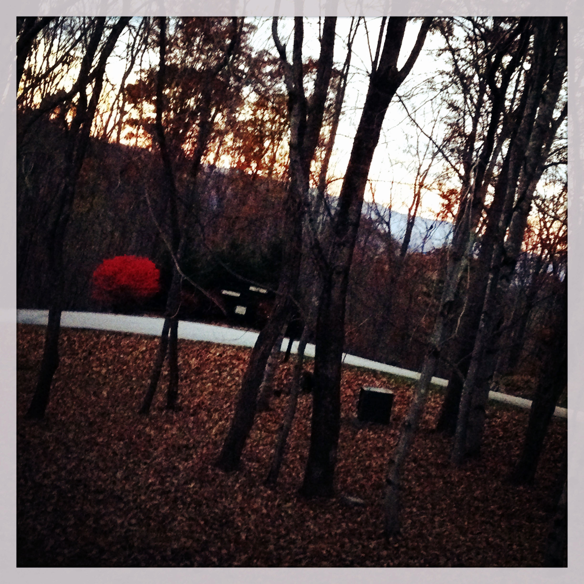 This stillness — here on this porch, watching this sunset through these silhouettes — this stillness is deafening. Not the silence, but the stillness. There is no breeze, no wind. No leaves raining down like snow as it has most other days. Just tall, stoic, empty and bare trees that almost seem to be afraid to breathe for fear that something else will be taken from them…they feel poured out.